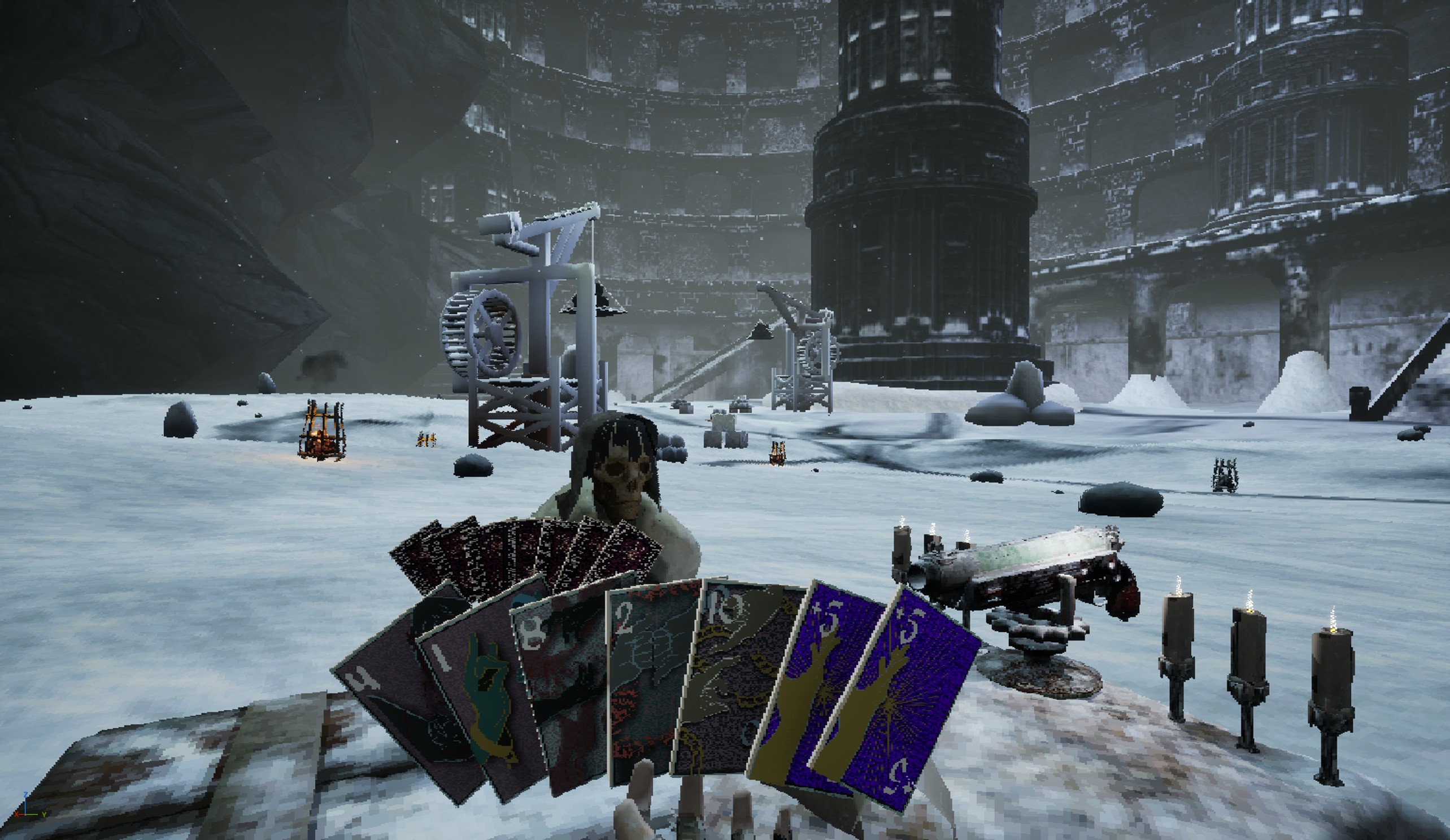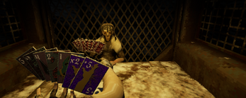The game is played across three stages: Courtyard, Elevator, and Cave. To win, you must defeat the dealer in each stage. As you progress deeper, the dealer becomes more intelligent, using its growing knowledge to select higher cards more consistently and punish poor decisions.